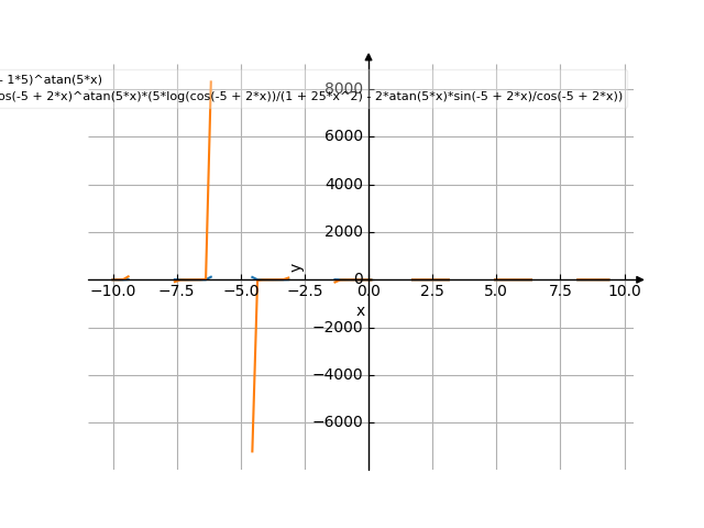 atan(5*x) |/ 5*log(cos(-5 + 2*x)) 2*atan(5*x)*sin(-5 + 2*x)\ 250*x*log(cos(-5 + 2*x)) 20*sin(-5 + 2*x) 4*sin (-5 + 2*x)*atan(5*x)|