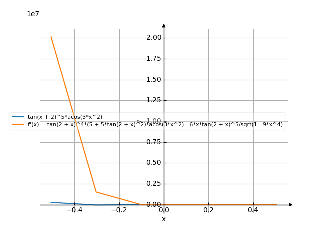 $$- \frac{6 x \tan^{5}{\left(x + 2 \right)}}{\sqrt{1 - 9 x^{4}}} + \left(5 \tan^{2}{\left(x + 2 \right)} + 5\right) \tan^{4}{\left(x + 2 \right)} \operatorname{acos}{\left(3 x^{2} \right)}$$